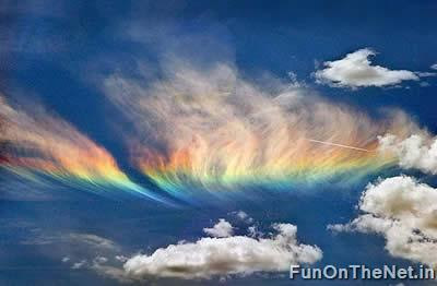 The atmospheric phenomenon known as a circumhorizon(tal) arc, or "Fire rainbow", appears when the sun is high in the sky (i.e., higher than 58° above the horizon), and its light passes through diaphanous, high-altitude cirrus clouds made up of hexagonal plate crystals. Sunlight entering the crystals' vertical side faces and leaving through their bottom faces is refracted (as through a prism) and separated into an array of visible colors. When the plate crystals in cirrus clouds are aligned optimally (i.e., with their faces parallel to the ground), the resulting display is a brilliant spectrum of colors reminiscent of a rainbow. The example shown above was captured on camera as it hung for about an hour across a several-hundred square mile area of sky above northern Idaho (near the Washington border) on 3 June 2006.